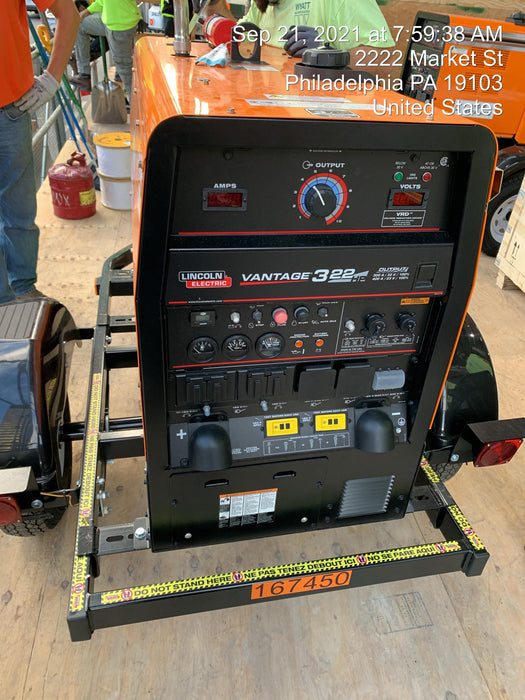 Machine Notes: 2021 Lincoln Electric Vantage 322 Vantage 322 Ready Pak 3 w/ Decals, ORANGE (includes trailer, cable rack, fender light kit) NO Telematics
